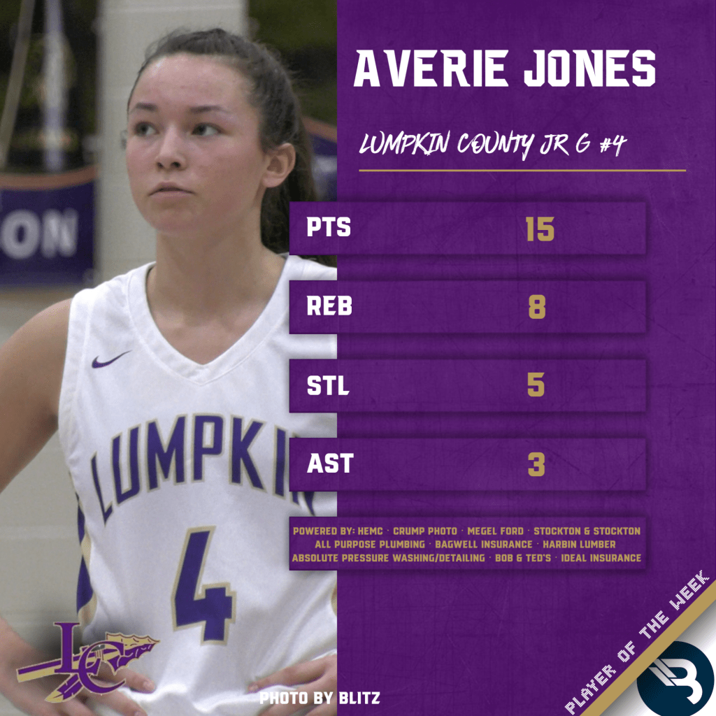 Averie Jones is a special talent. The Lady Indians star guard poured in 18 points, grabbed 8 boards, and tallied 5 steals and 3 assists last week for #3-ranked Lumpkin County against #10-ranked Dawson County. The junior guard earned her third career POW award.