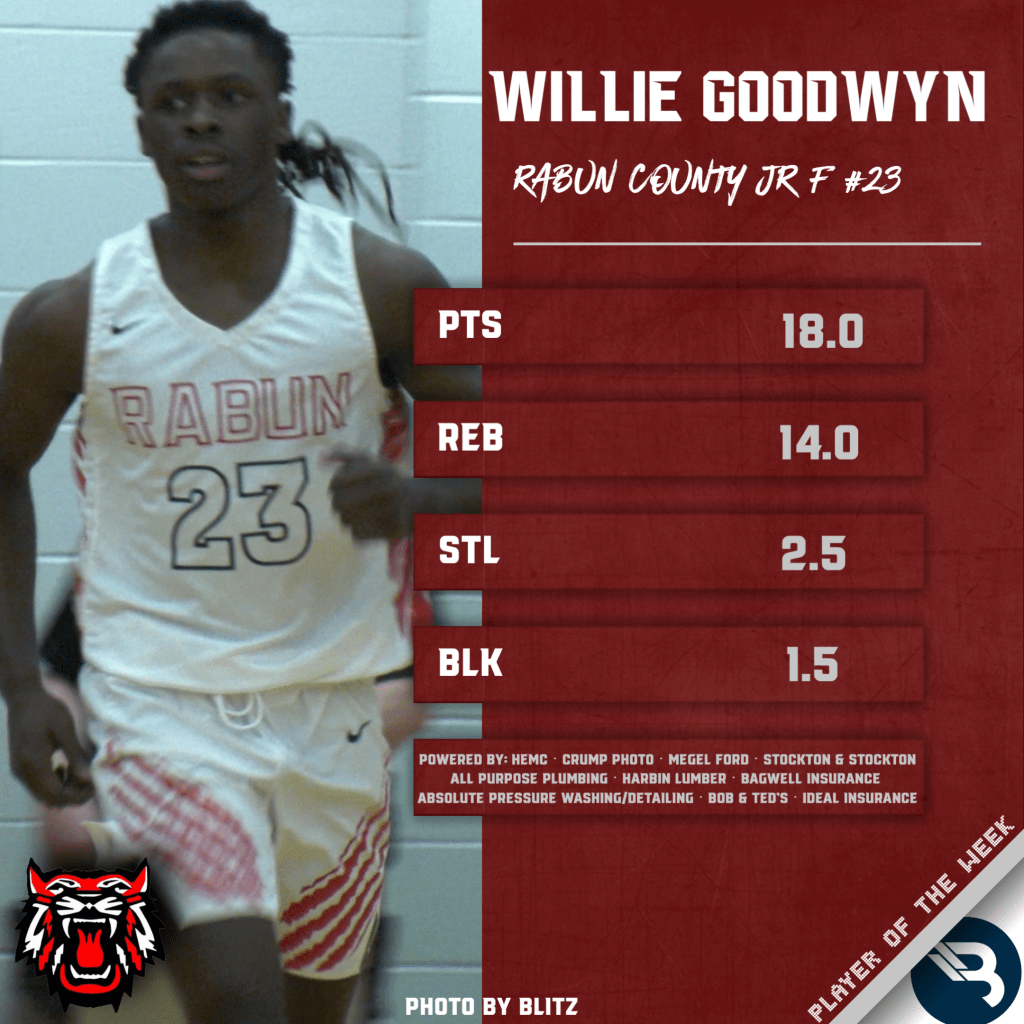 Willie Goodwyn is a legit next level athlete. The Rabun County junior forward averaged 18 points and a ridiculous 14 rebounds last week for the Wildcats, adding 2.5 steals and 1.5 blocks across a pair of contests. This is Goodwyn’s second POW award, the other coming in football.