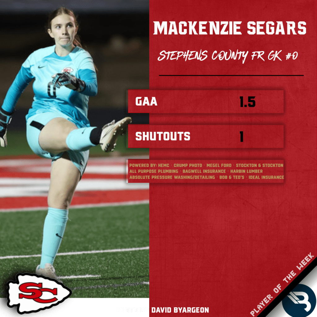 Freshman MacKenzie Segars earns her first POW award. The Stephens County GK made several clutch saves last week across a pair of matches, averaging 1.5 goals against and posting a shutout.