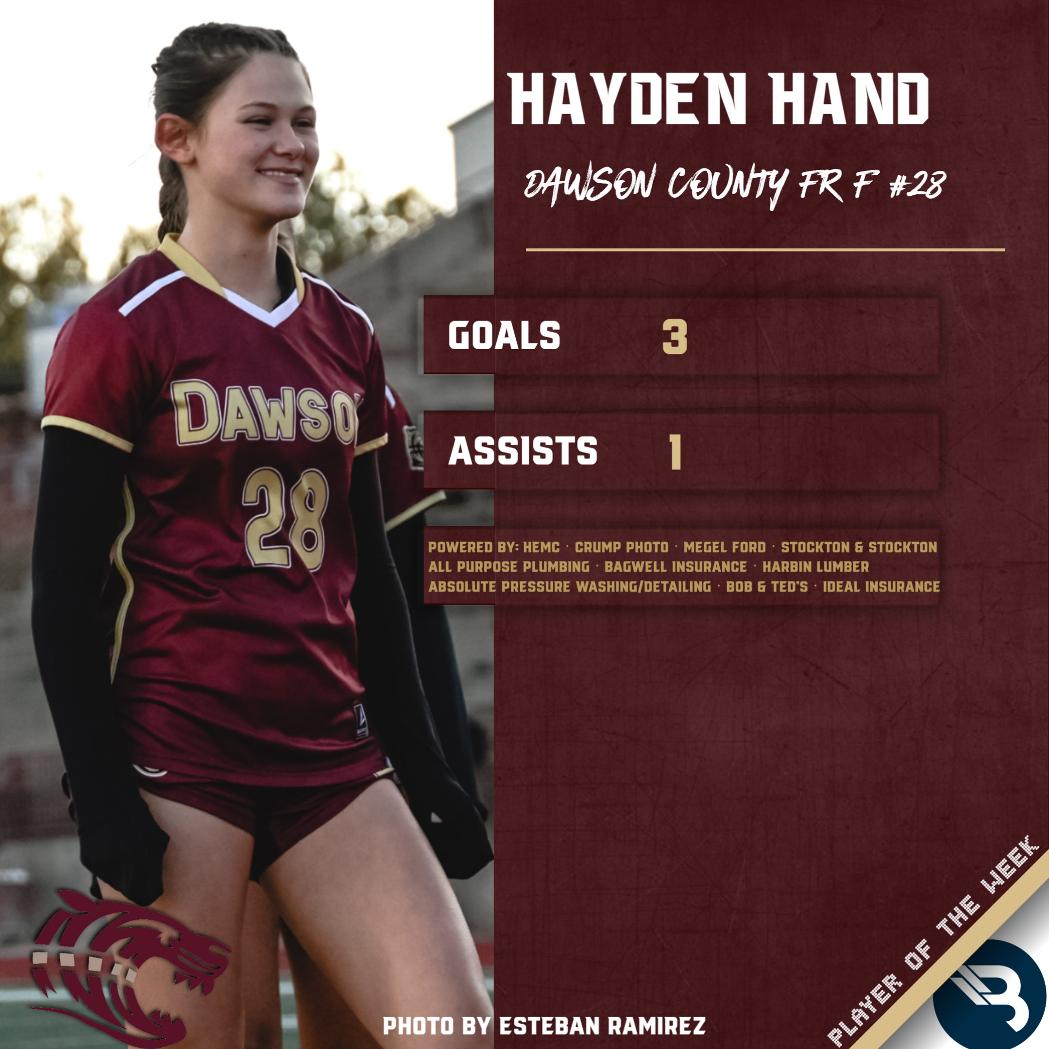 Top-5 ranked Dawson County got a huge outing last week from Lady Tigers’ freshman forward Hayden Hand. Hand, who now has 2 Player of the Week awards after earlier this year claiming one in cross country, tallied a hat trick with 3 goals, and added an assist.