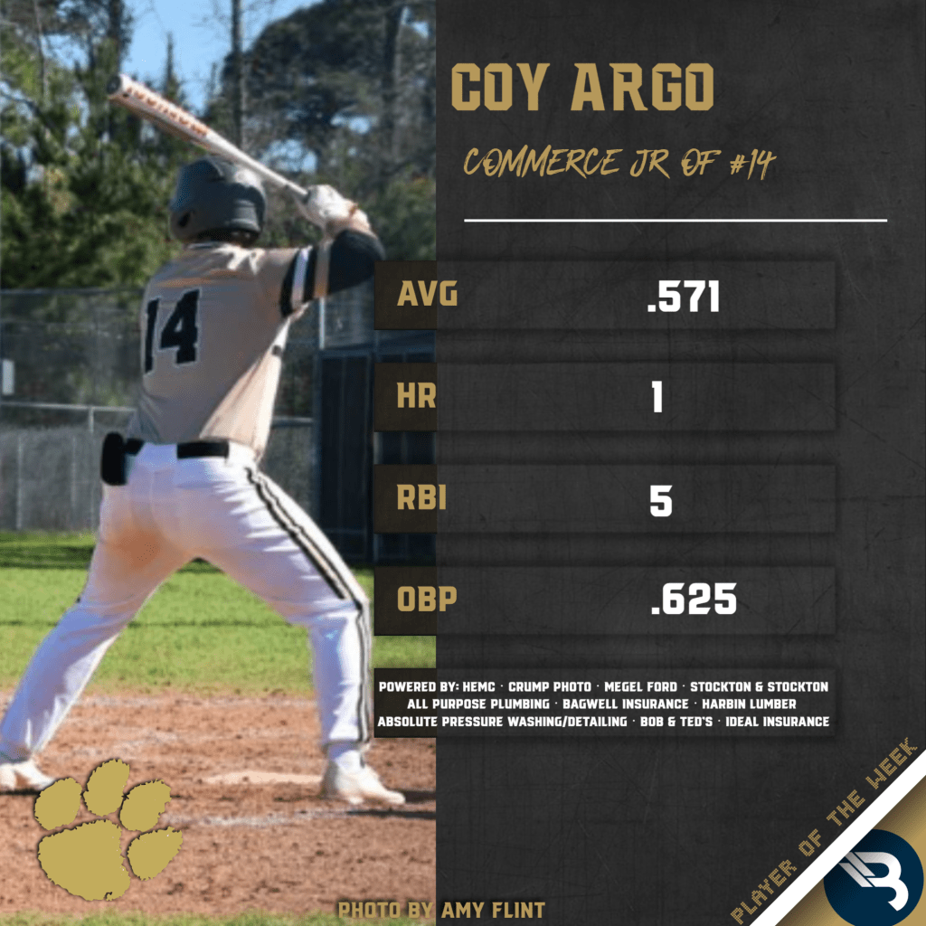 Coy Argo blasted a walkoff Grand Slam in a win for the Commerce Tigers last week. In 2 games, the junior outfielder hit .571, going 4-for-7, with the homer, 5 RBI, and a .625 OBP. This is Argo’s first POW award.