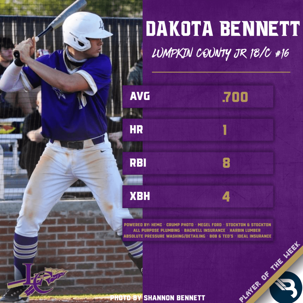 Talk about one of the best game’s you’ll see. Junior Dakota Bennett showed out last week for the Indians, particularly in a game against Flowery Branch. #10-ranked Lumpkin County saw its 1B/C bat .700 for the week, going 7-for-10. Against FB, he hit for the cycle, with his homerun a Grand Slam! All told, he hit .700 with 1 HR, 8 RBI, 1 2B, and 2 3B. This is Bennett’s first POW award.