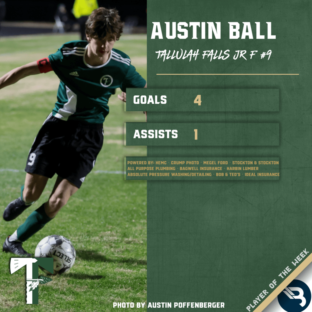 The BLITZ Boys Soccer Player of the Week Fan Vote winner was Austin Ball (Tallulah Falls) with 16,950 of the 36,008 total votes. BLITZ then named Chase Johnson (Jefferson) as Co-POW.