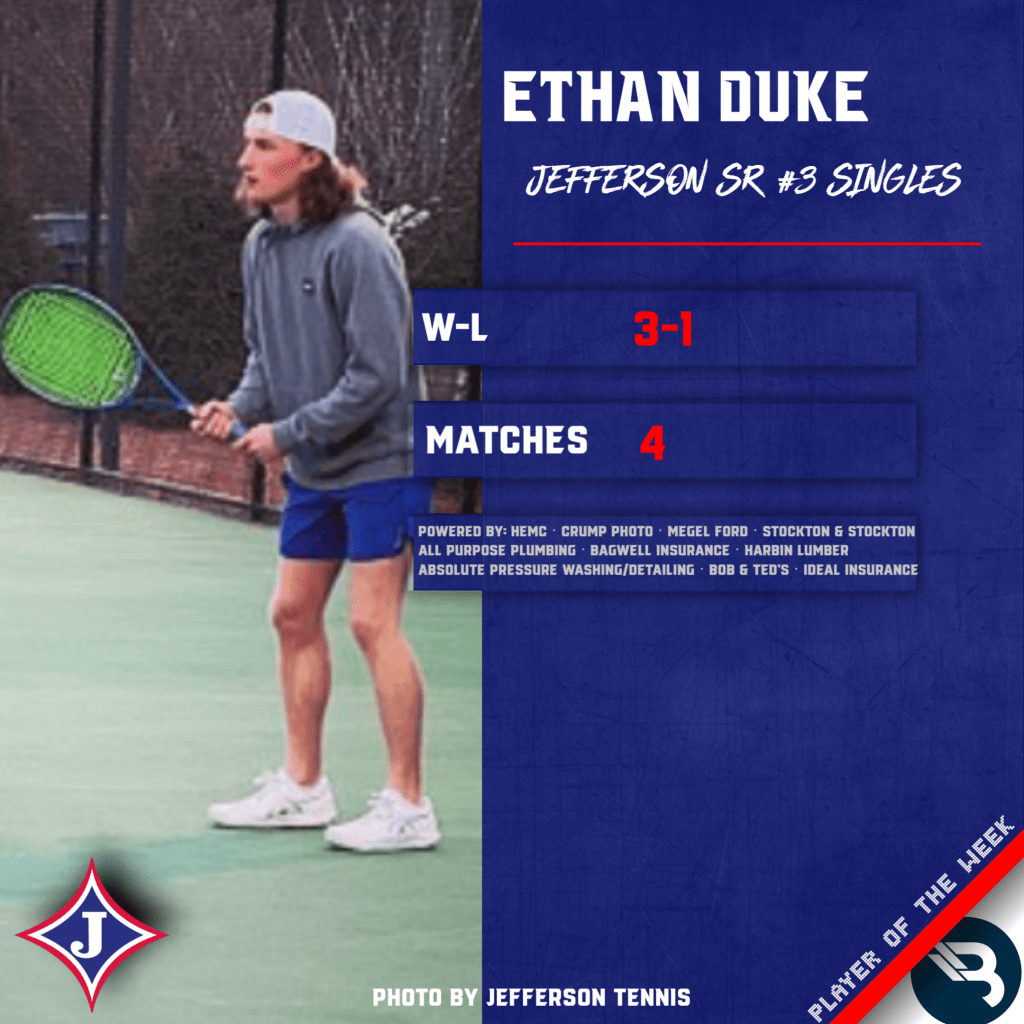 Jefferson’s #3 Singles player Ethan Duke competed in 4 matches in what marked a busy week for the Dragons. The senior went 3-1 in those matches, earning his first-ever BLITZ POW award.