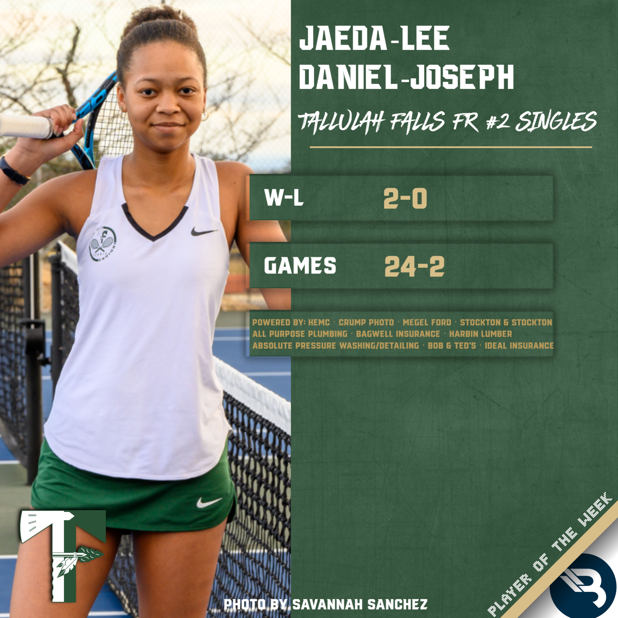 Freshman Jaeda-Lee Daniel-Joseph has been nothing short of phenomenal in her first season. The Tallulah Falls #2 singles player has gone 8-0 on the season, and last week was 2-0, going 24-2 in games to win both matches in straight sets. This is Daniel-Joseph’s first POW award.