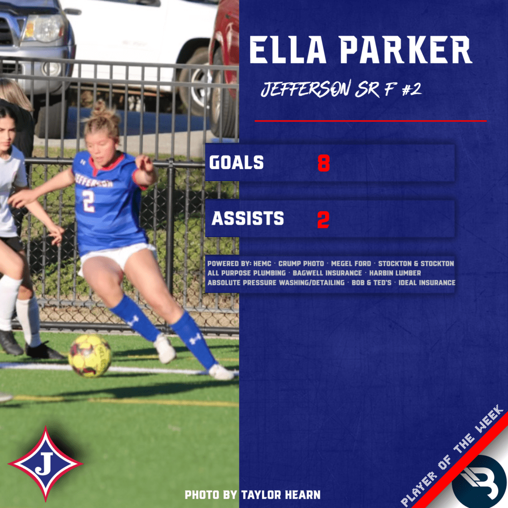 Ella Parker earns POW honors after an amazing performance last week for the Jefferson Lady Dragons. The senior forward blasted home 6 goals in a single match, which is a new program record. She had 8 goals and 2 assists altogether in 2 matches played last week. This is Parker’s second POW award of her career.