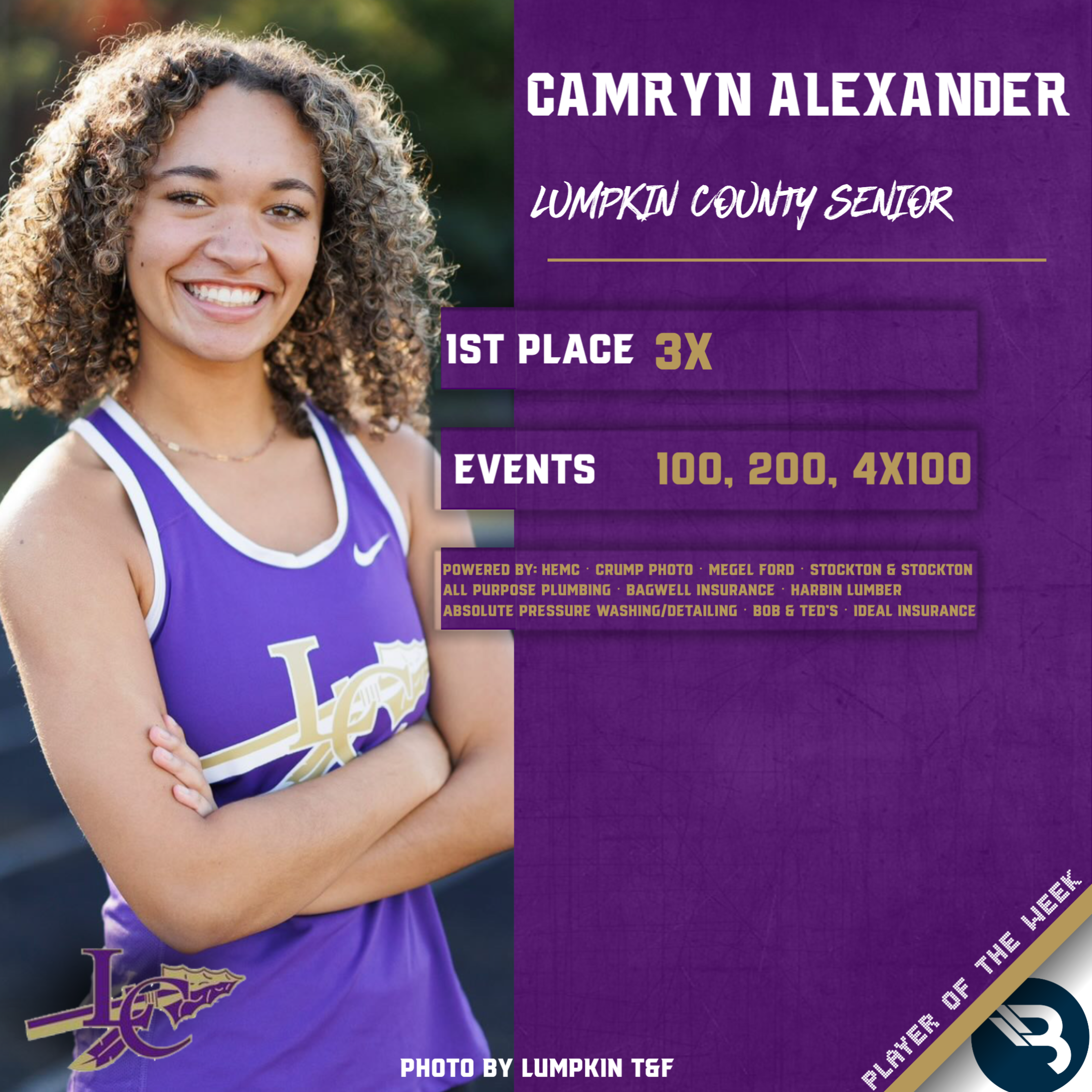 Camryn Alexander grabs her first-ever POW award after finishing atop the podium with 1st-place finishes last week in the 100 and 200 at a Lumpkin County tri-meet. She also was a pivotal part of the 1st-place 4×100 relay team.