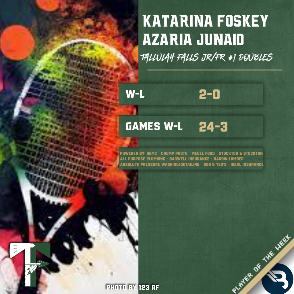 The BLITZ Girls Tennis Player of the Week Fan Vote winner was Katarina Foskey & Azaria Junaid (Tallulah Falls) with 17,892 of the 39,329 total votes. BLITZ then named Abby Sego (Rabun County) as Co-POW.