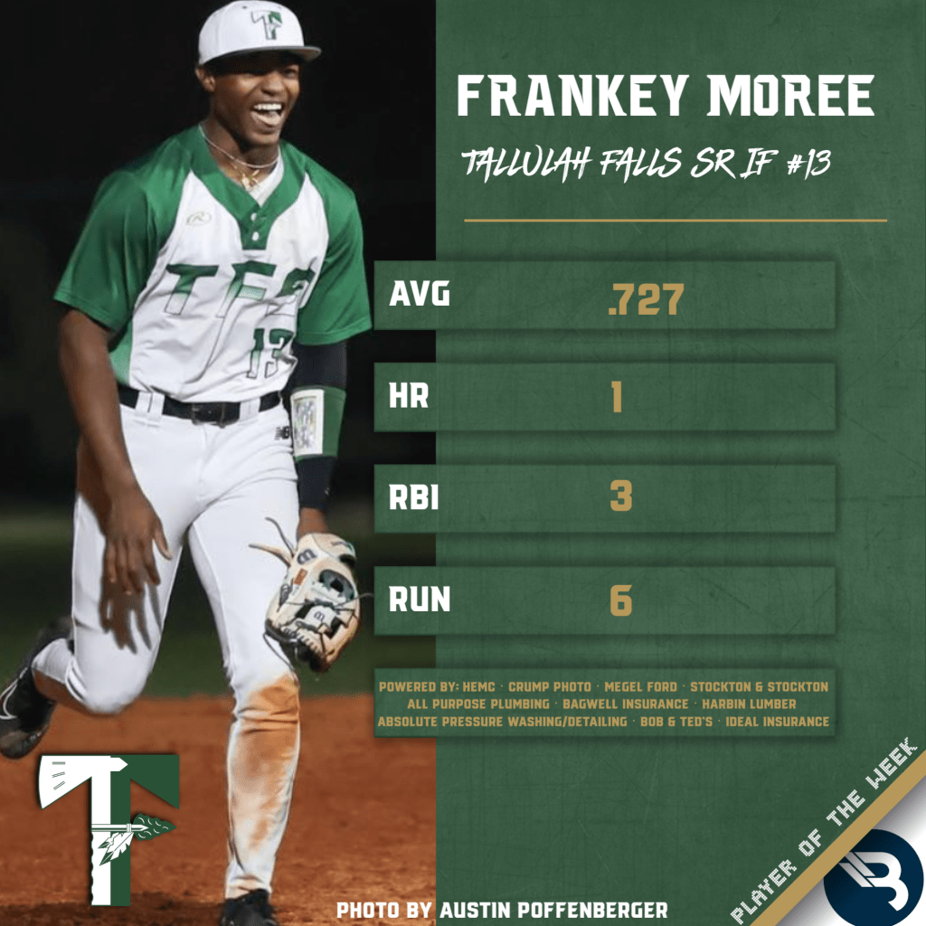 Frankey Moree is at it again. The Tallulah Falls senior infielder notched his second POW award this season after a week in which he batted .727 by going 8-for-11 at the plate. That included a homerun, 3 RBI, and 6 runs scored, while adding 3 stolen bases over a 3-game stretch.