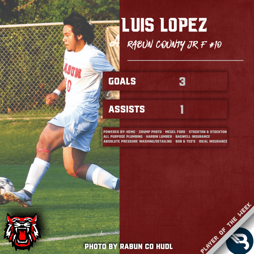 Luis Lopez recorded a hat trick last week for Rabun County, with 3 goals and 1 assist. This is the junior forward’s first POW award.