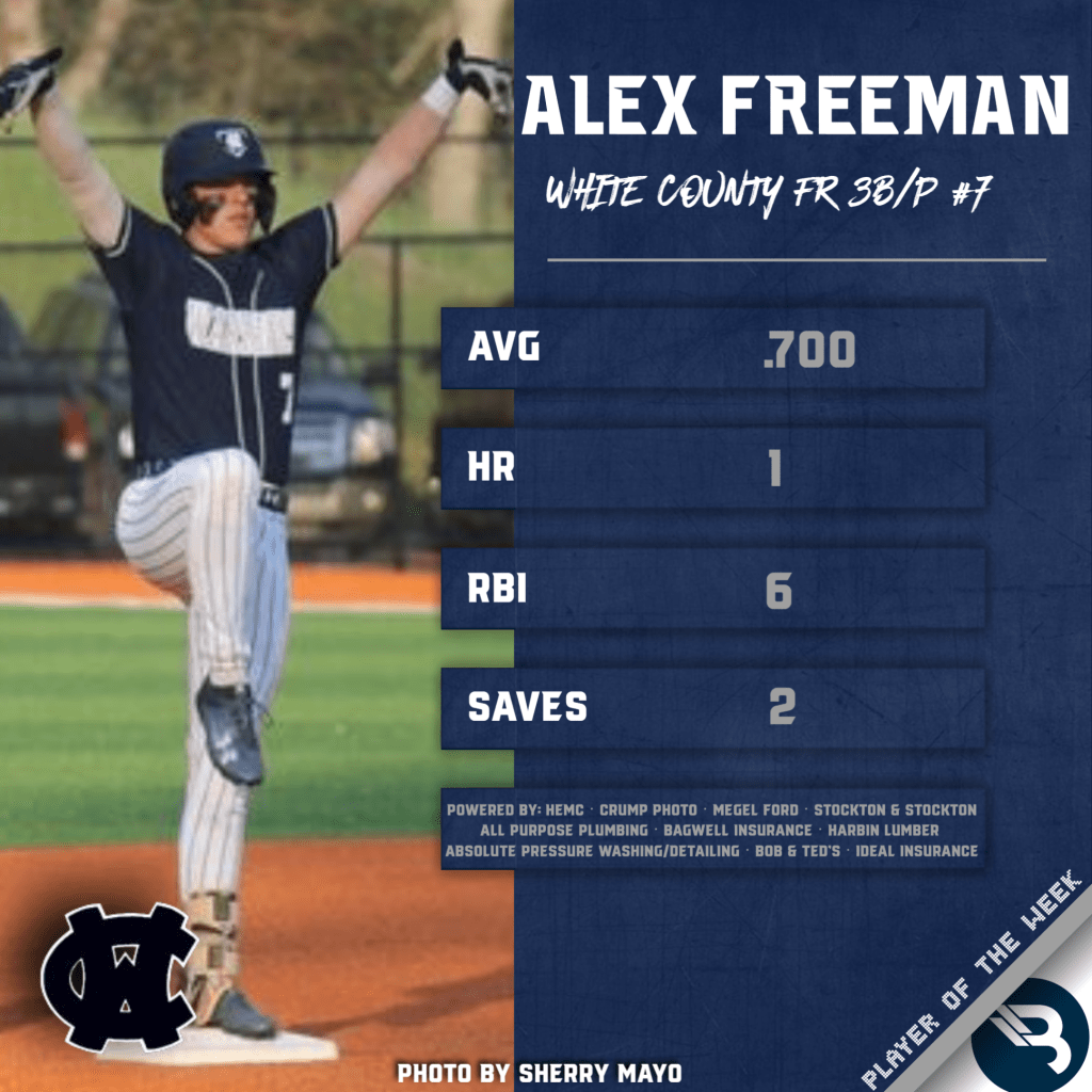 What a phenomenal week for freshman Alex Freeman. The White County pitcher/third baseman batted .700 by going 7-for-10 at the plate with a homerun, 6 RBI, 3 runs scored, and 2 doubles. He posted a .769 OBP, 1.969 OPS, and 1.200 SLG percentage. On the mound, he notched 2 saves with a 0.00 ERA and 2 strikeouts in 3.1 innings of work, giving up just a single hit. This is Freeman’s first POW award.