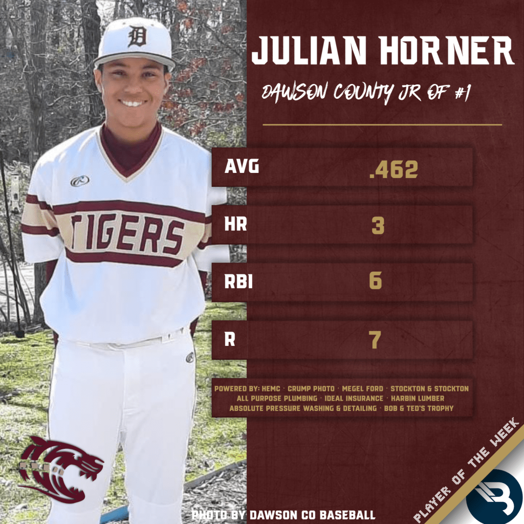 Dawson County’s Julian Horner had a monster 3-game stretch for the state playoff bound Tigers. Horner hit .462, going 6-for-13 at the dish. That included blasting 3 homeruns and driving in 6 runs, scoring 7 himself while adding 2 doubles and 2 walks as well as a hit by pitch. That came out to an insane .563 OBP and 1.308 SLG percentage. This is Horner’s second career POW award.