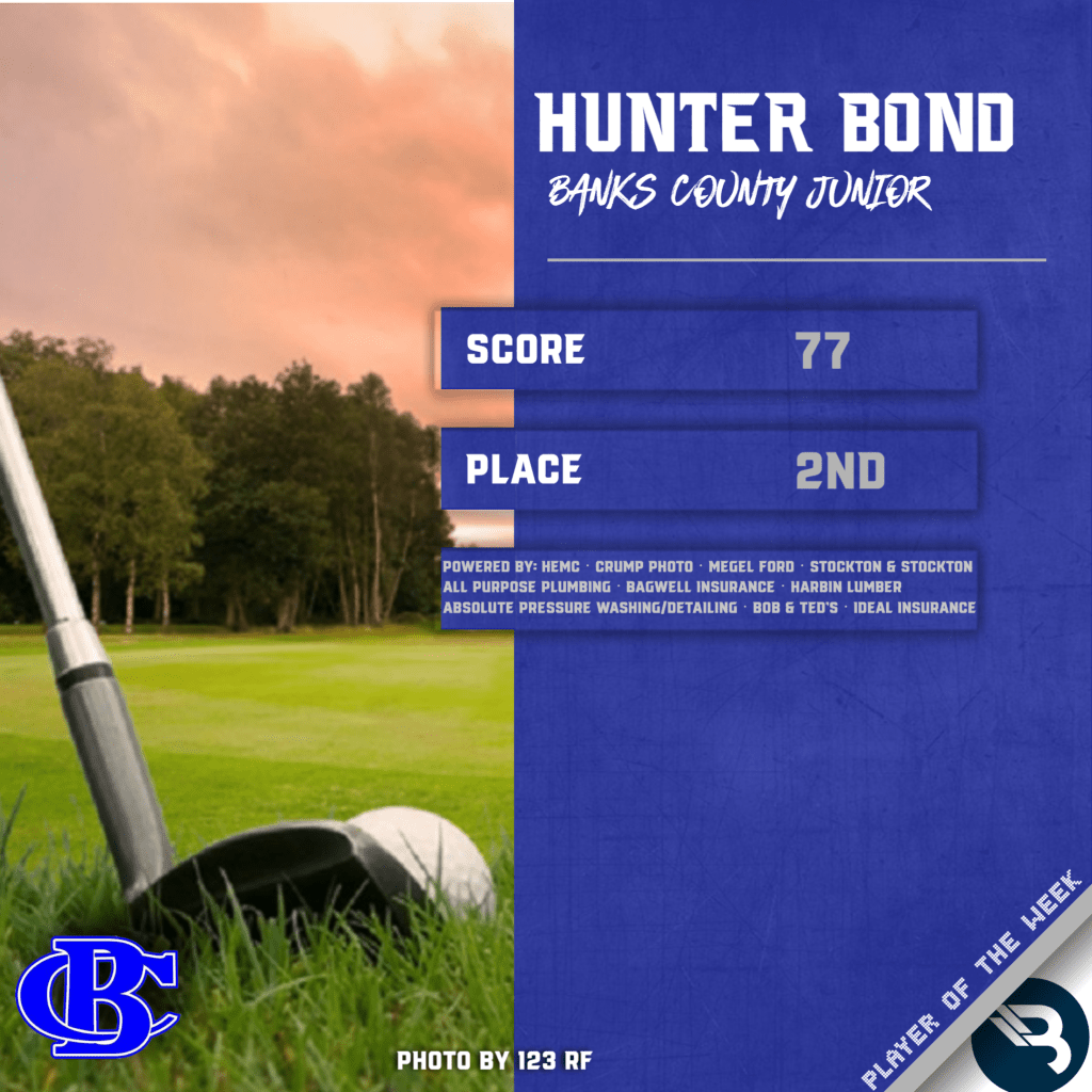 Bond…Hunter Bond. The Banks County junior carded a 77 in the Area Tournament, marking a personal best for him on the season. That was good for 2nd place individually, and lifted the Leopards to an Area Championship. This is Bond’s first POW award.