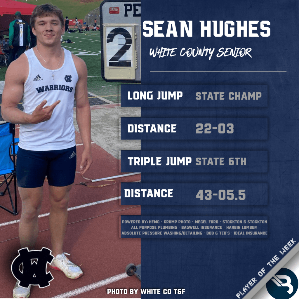 Sean Hughes won the GHSA State Championship in the long jump with a distance of 22-03, just 2 inches from his PR he set at region. He also came in 6th in the triple jump with a 43.5.5 distance. This is Hughes’ second POW award.