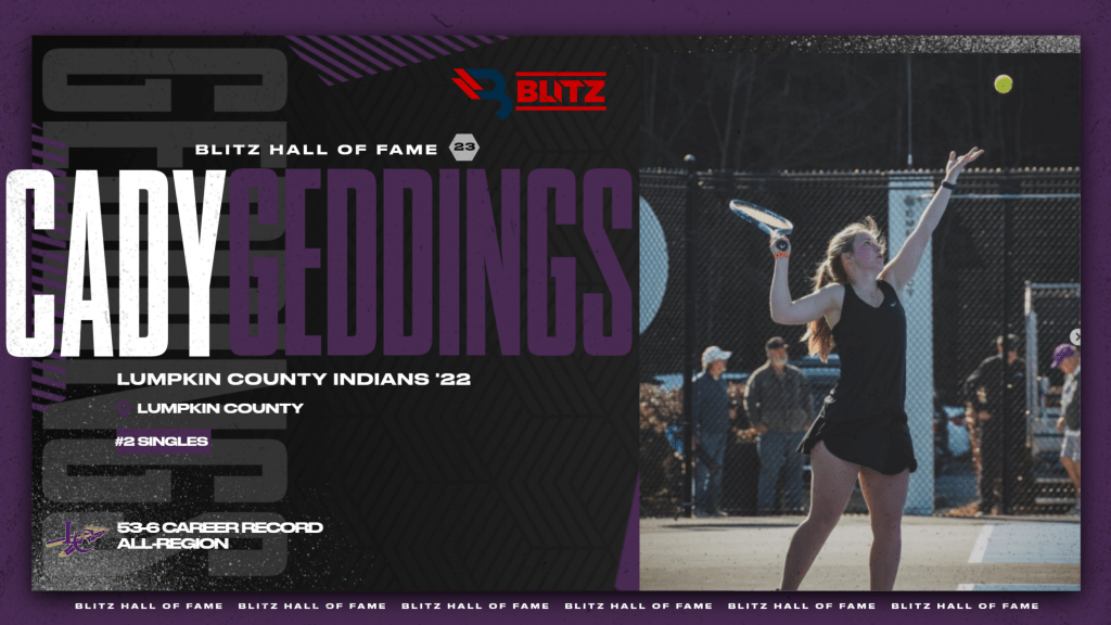 Cady Geddings was a standout for the Lady Indians at Lumpkin County, posting back-to-back-to-back 10-plus win seasons at #2 singles. After going 13-3 at the #2 singles line as a 2021 junior, she piggybacked off that with a 16-3 2022 season, giving her 53 wins in her career against just 6 losses. Geddings went on to play tennis at Brenau University. (494 votes)