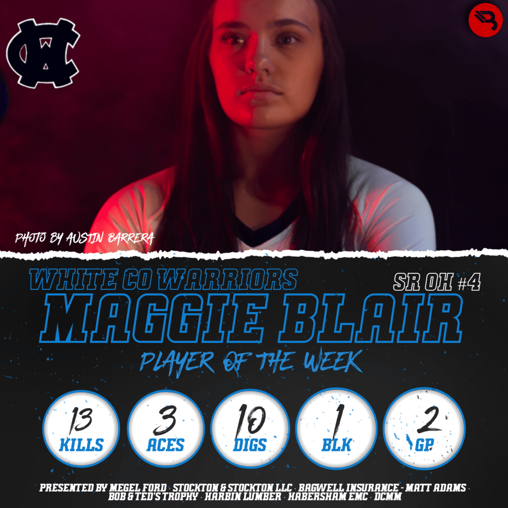 Senior Maggie Blair has been instrumental in the great start for the Lady Warriors. Last week, White County gave Jefferson all it could handle in a 2-1 loss, but soared past Athens Academy 2-0. Outside hitter Blair had 13 kills, 10 digs, 3 aces, and a block. This is her first POW award.