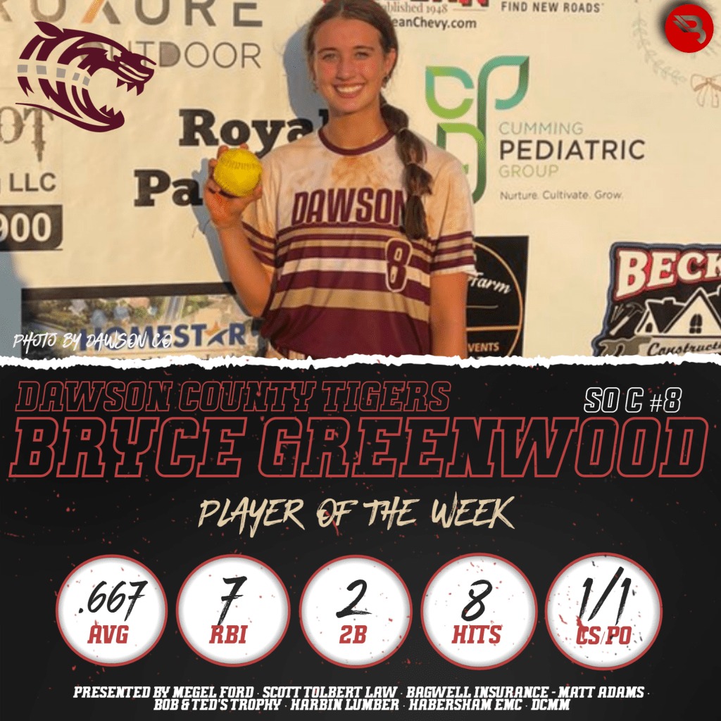 Bryce Greenwood went 8-for-12 at the plate for Dawson County last week, good for a .667 average. She had 7 RBI and a pair of doubles, and had a Caught Stealing from behind the plate, and picked off a runner. All that in just 3 games! This is Greenwood’s second career POW award.
