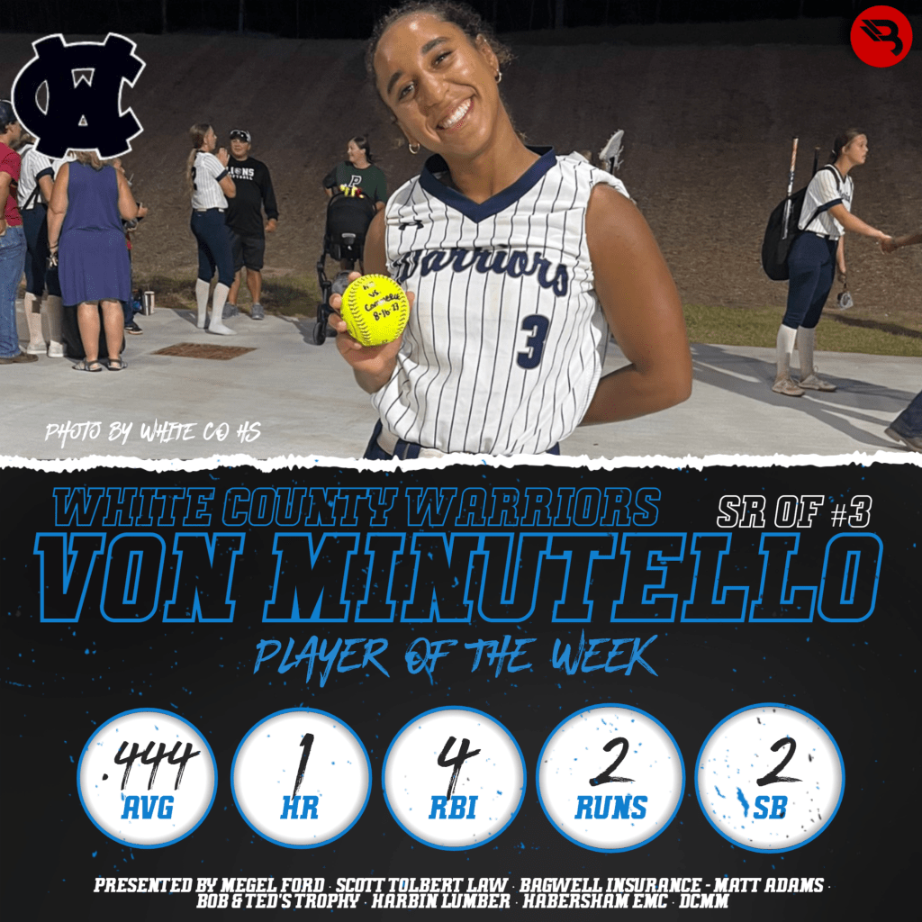 Yvonne ‘Von’ Minutello led the #7-ranked Lady Warriors last week by batting .444 with a homerun, 4 RBI, 2 runs, and 2 stolen bases. The senior outfielder/utility player has been and will continue to be crucial to the White County season. This is her first POW award.
