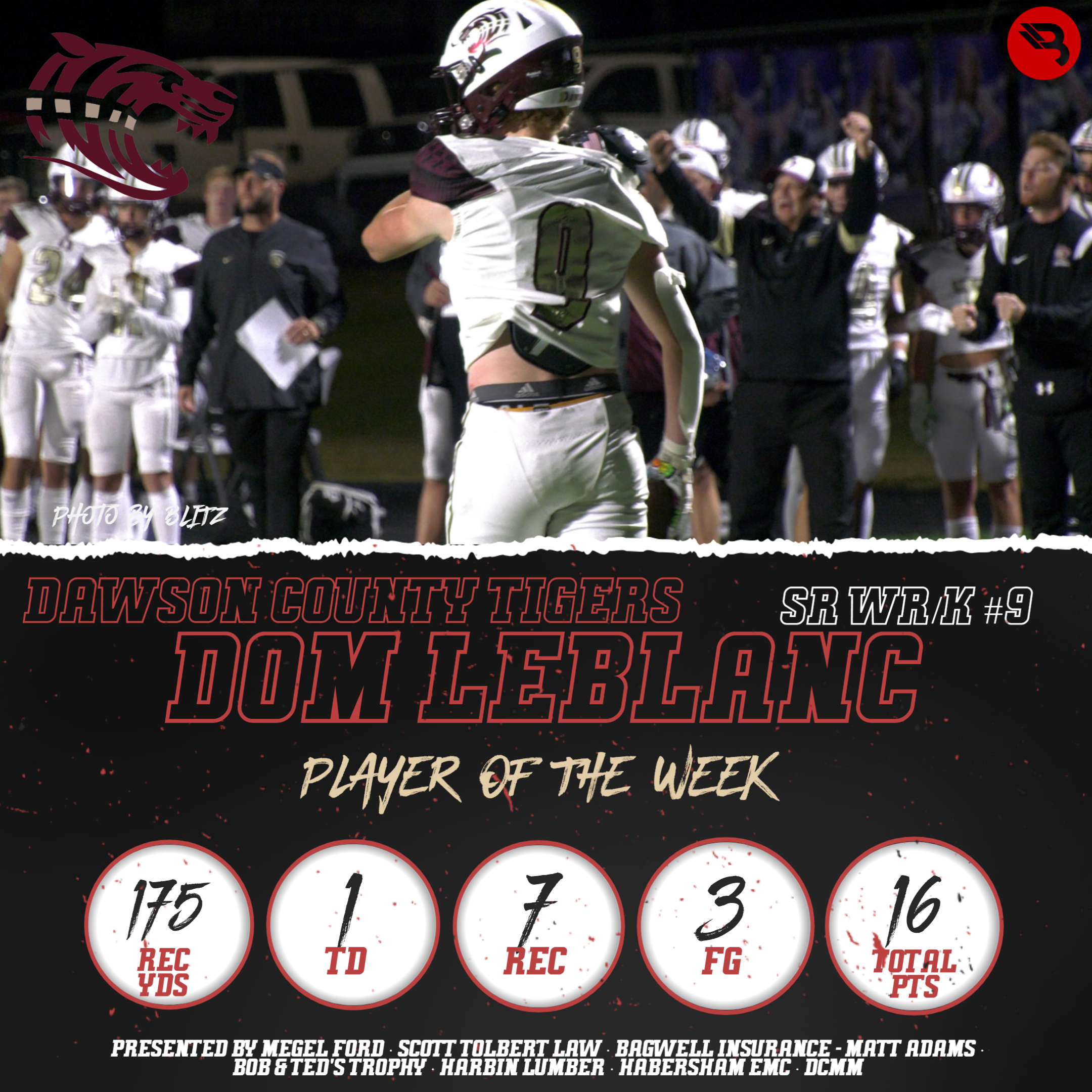 The BLITZ Football Players of the Week are Mason Sullens (Lumpkin County), Sammy Brown (Jefferson), and Dom LeBlanc (Dawson County). Sullens won the Fan Vote with 1,751 of the 6,053 total votes. Brown and LeBlanc were the BLITZ Picks.