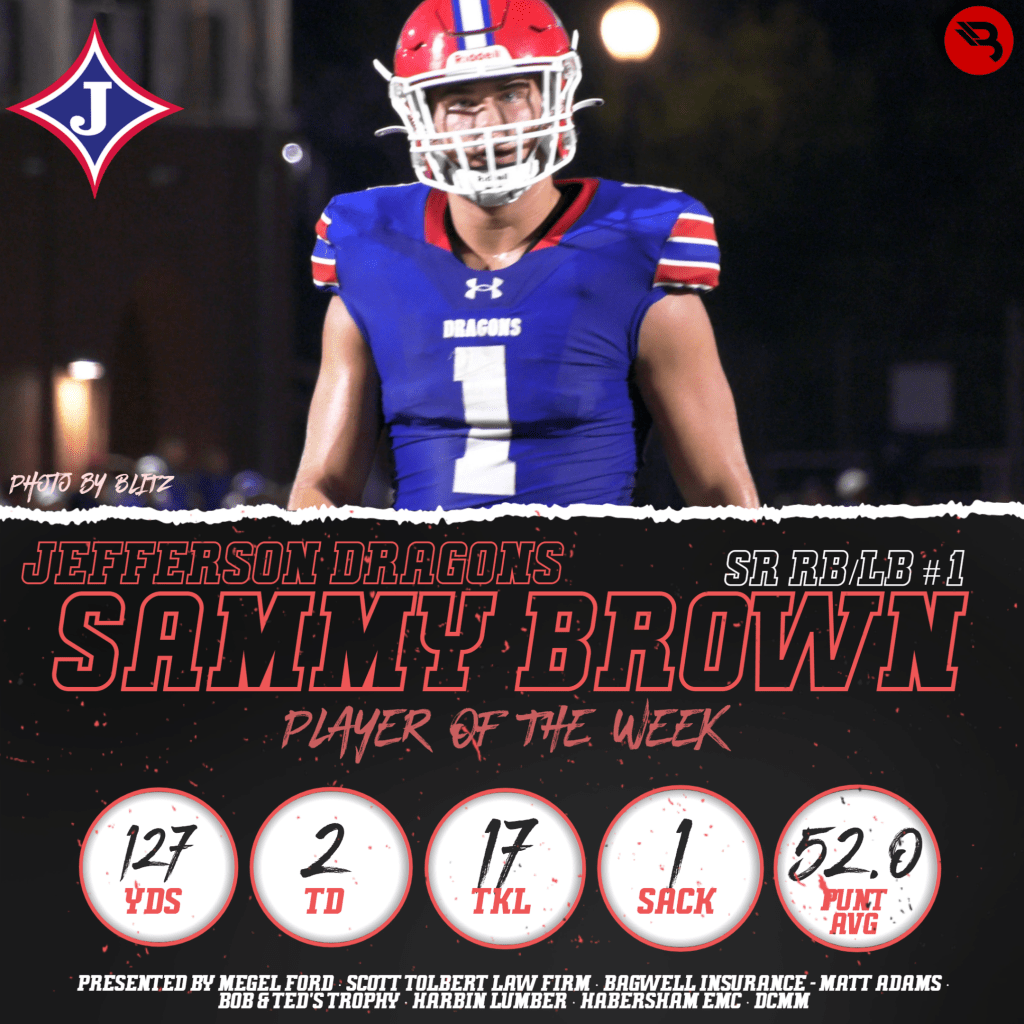 Yeah, you’re probably thinking, Sammy Brown, again? Yes! He’s that good! The 5-star Clemson commit had 127 rushing yards and 2 TD, added 17 tackles (read that again), a sack, and had 3 punts for an average of 52 yards in the #4-ranked Dragons’ win over Wren (SC). Didn’t know he had that in his toolkit, but there it is. All 3 punts landed inside the 20, and one went for 75 yards! This is Brown’s 10th career POW award, putting him among just two others to have 10 or more POW awards (Gunner Stockton with 19, Ivy Tolbert with 11, Sammy Brown with 10).