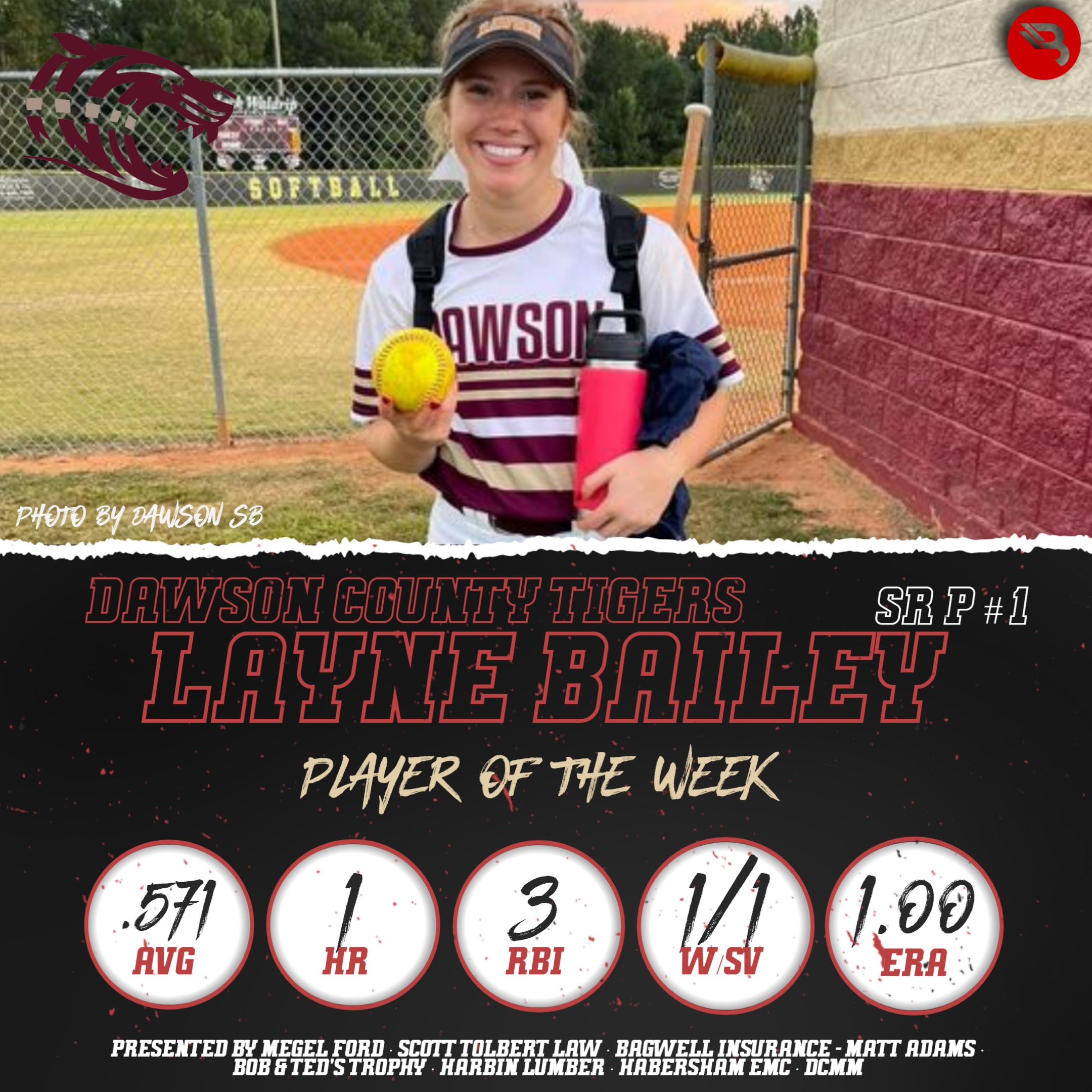 What a performance it was for Layne Bailey! The senior star for the Lady Tigers vaulted Dawson County into the state rankings with a win over #7-ranked White County. The pitcher not only did it in the circle, but at the plate. Against White County, she had a homerun and 3 RBI (all the runs for DC) in the 3-1 win, batting .571 (4/7). She threw a complete game in the win, allowing one run and striking out 6 across 9 innings while notching a save last week.