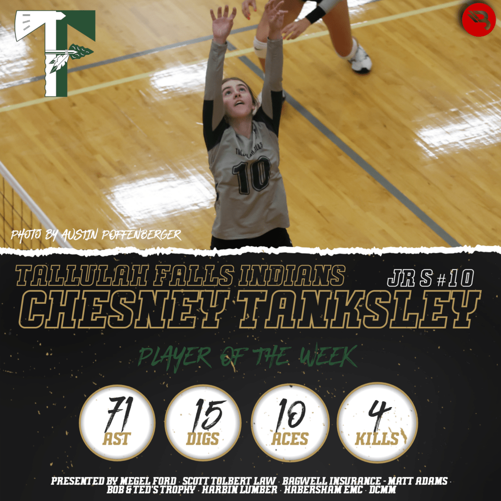 Tallulah Falls is on a hot win streak that currently sits at 9. The #6-ranked Lady Indians have gotten big production from junior setter Chesney Tanksley, who had 71 assists, 15 digs, 10 aces, and 4 kills last week in 4 matches. This is Tanksley’s first POW award.