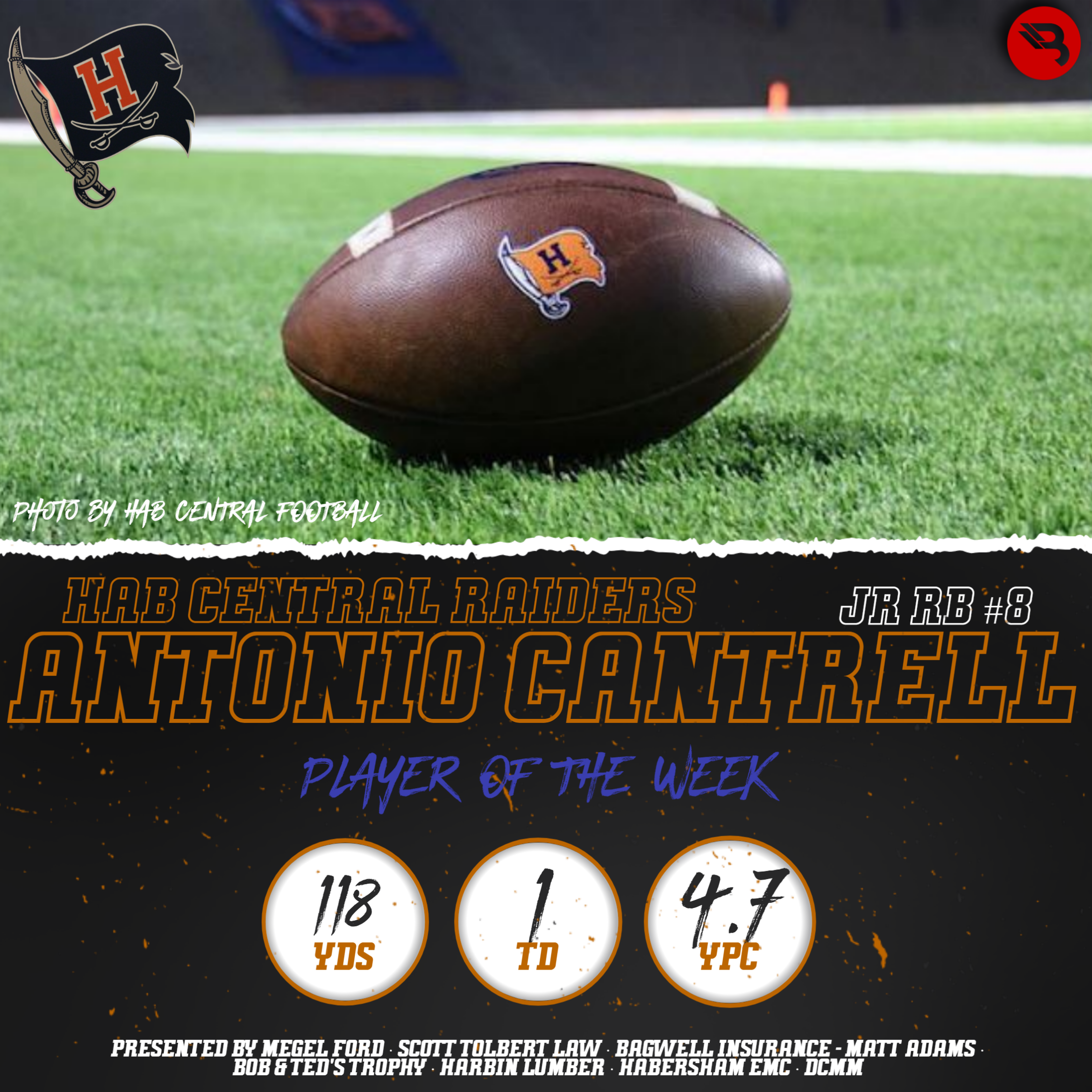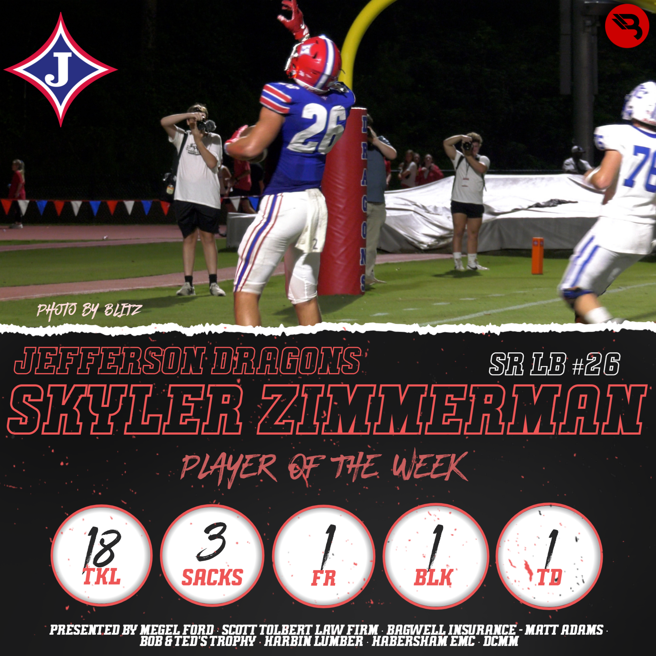 The BLITZ Football Players of the Week are Antonio Cantrell (Habersham Central) and Skyler Zimmerman (Jefferson). Cantrell won the Fan Vote with 9,761 of the 18,404 total votes. Zimmerman was the BLITZ Pick.