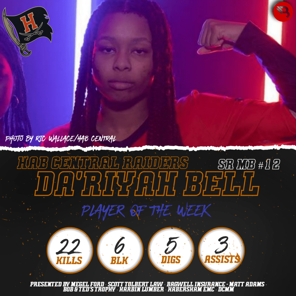 Habersham Central got a big boost from senior Da’Riyah Bell. The middle back had 22 kills through 5 matches last week for the Lady Raiders, and added 6 blocks, 5 digs, and 3 assists. She had a .245% kill percentage. This is Bell’s first POW award.