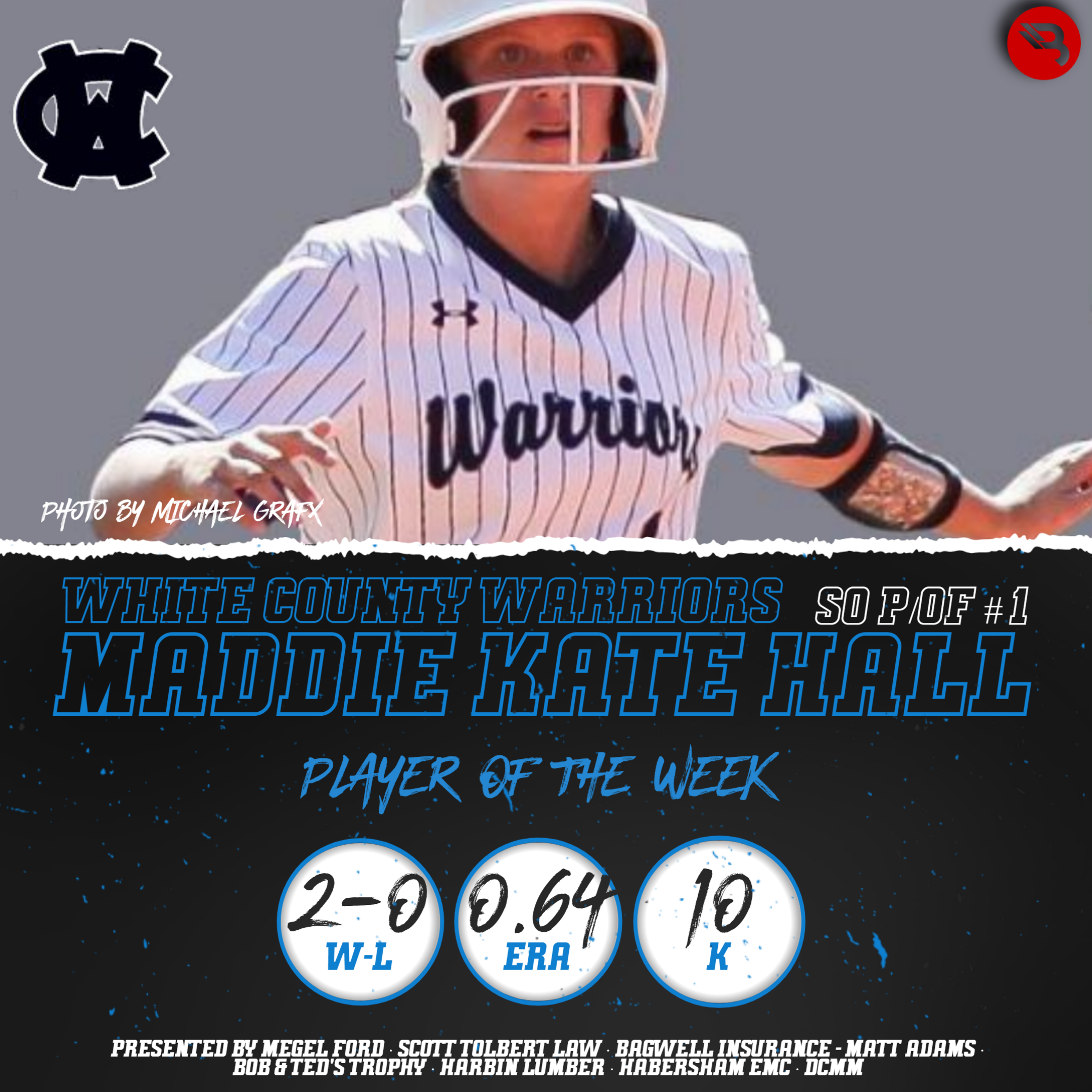 White County’s Maddie Kate Hall was fantastic in the circle. The sophomore was 2-0 and pitched to the tune of a 0.64 ERA, striking out 10 batters in the process. This is Hall’s first POW award.
