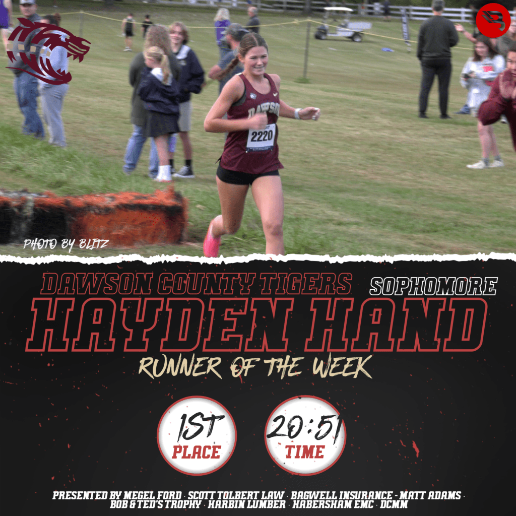 The BLITZ XC Runners of the Week are Dawson County’s Hayden Hand and Audrey Hotard of Habersham. Hand won the Fan Vote with 853 of the 998 total votes. Hotard was the BLITZ Pick.