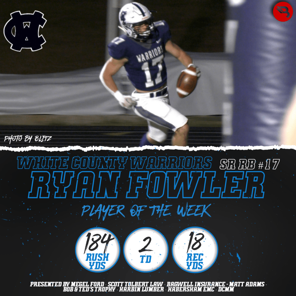 Ryan Fowler has had a monster season. He emerged as one of the top running backs in the state. To that point, the last state leaderboard showed the senior from White County at 23rd in the state in rushing. That was prior to a 184-yd, 2-TD performance against Gilmer in a win-or-die for the Warriors. Fowler even had one big TD called by on a holding penalty that wouldn’t have even been needed. For the season, Fowler has 1,430 yards and 14 TD on the ground. This is his second career POW award.
