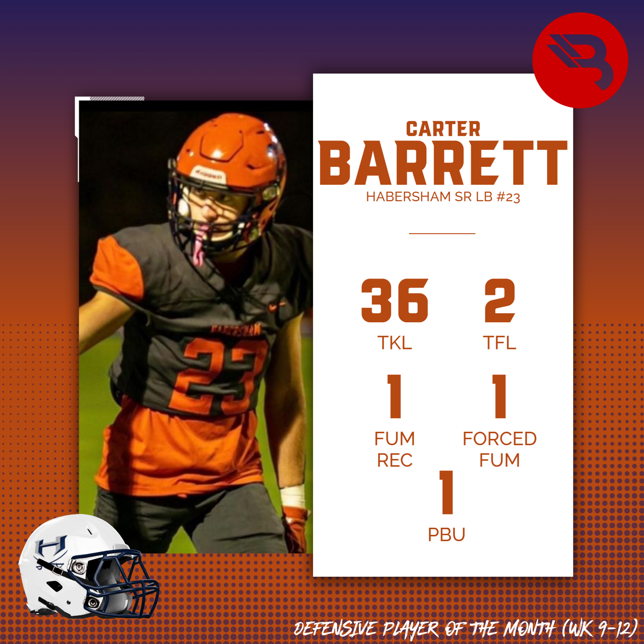 Carter Barrett is putting a cap on his stellar career for the Raiders. The senior LB helped get Hab Central into the playoffs with his clutch play. Barrett, from Weeks 9-12, had 36 tackles (2 for loss), a forced fumble, fumble recovery, and a PBU to his credit. This is his first BLITZ award.