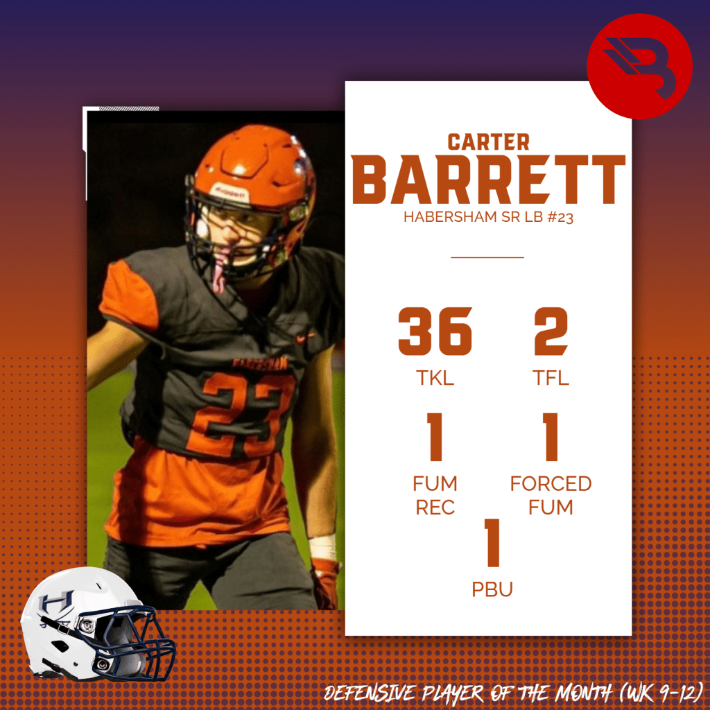 The BLITZ Football Defensive Players of the Month are Rett Hemphill (Jefferson) and Carter Barrett (Habersham Central). Hemphill won the Fan Vote with 12,749 of the 24,243 total votes. Barrett was the BLITZ Pick.