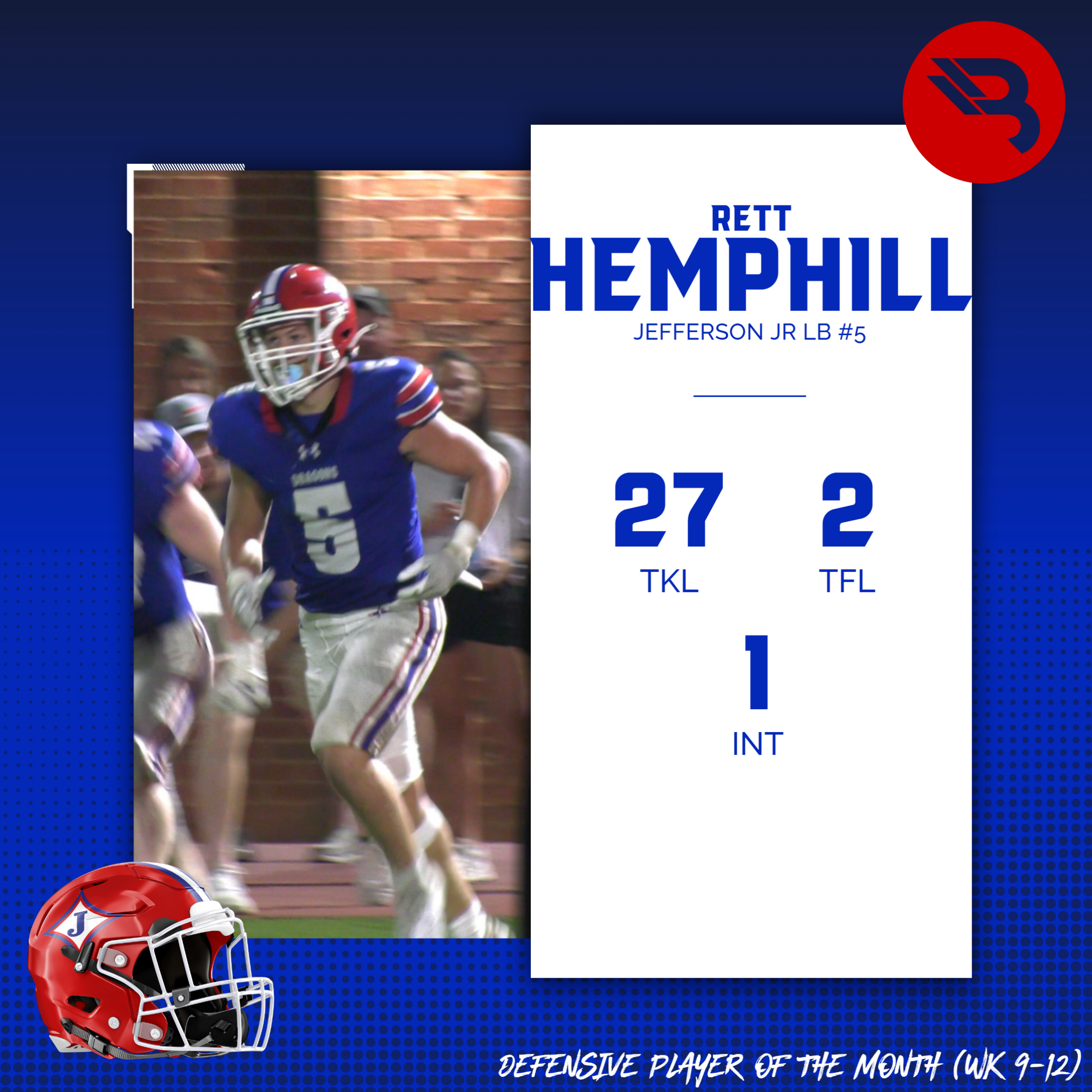 Rett Hemphill has had a standout season. The junior OLB was one of the top defensive players on an incredible Jefferson defensive unit. Hemphill had 27 tackles across Weeks 9-12, recording 2 TFL and an interception. This is Hemphill’s first BLITZ award.