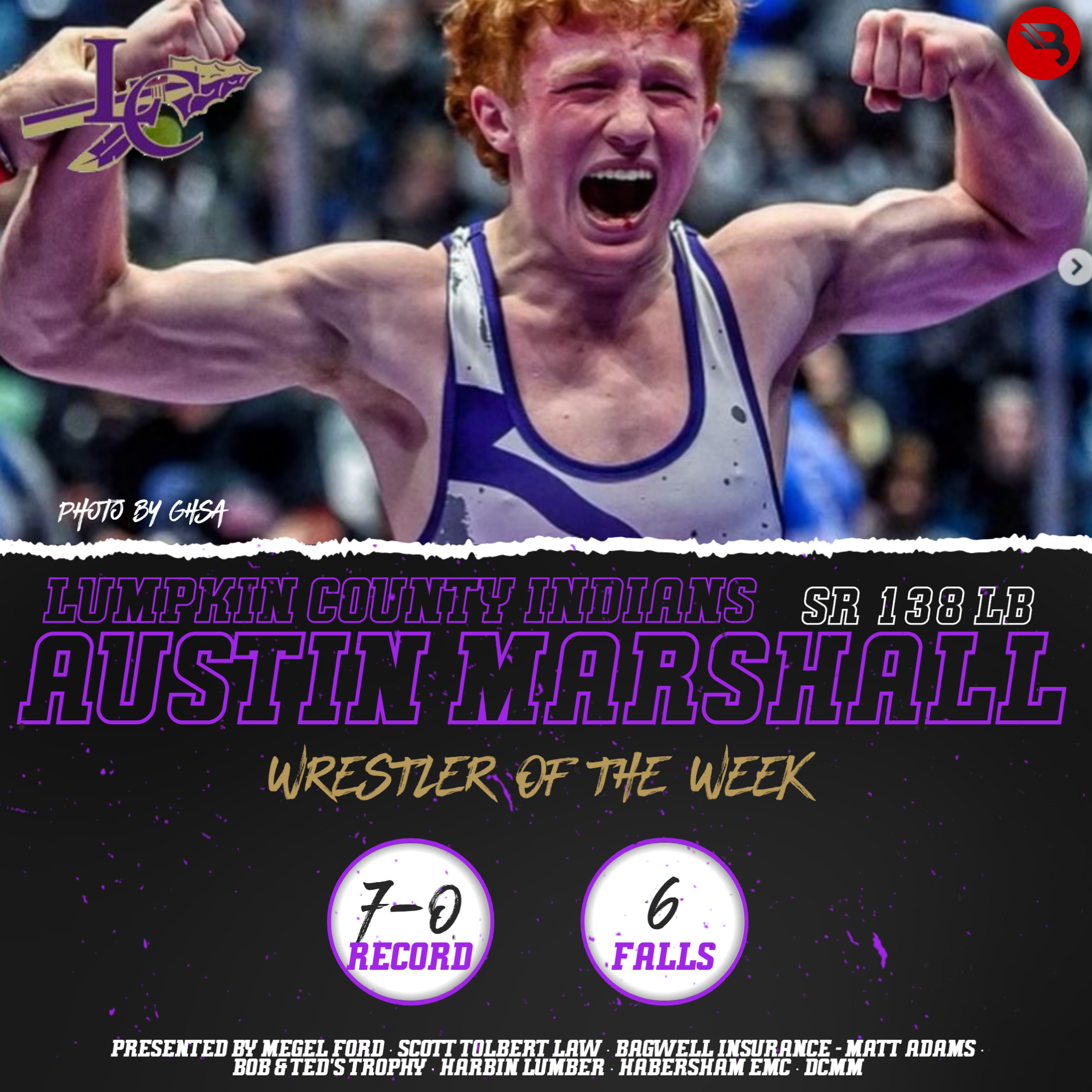 The defending state champion for Lumpkin County went 7-0 last week in the 138-lb bracket for the Indians, tallying 6 falls and a FF. He won his 100th career match as part of that success. This is Austin Marshall’s second career Wrestler of the Week award.