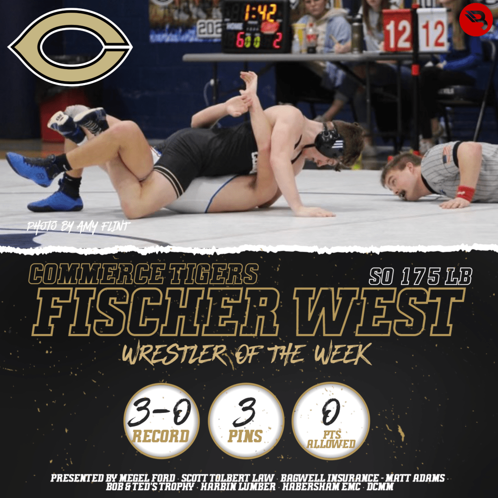 Commerce sophomore Fischer West went 3-0 last week for the Tigers. The sophomore allowed no offensive points, and recorded 3 pins at the 175-lb class. This is his first Wrestler of the Week award.