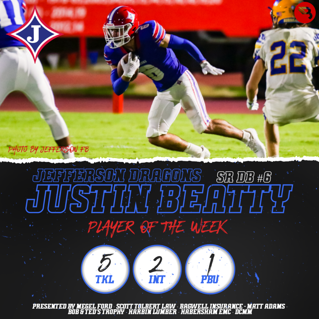 The BLITZ Football Players of the Week are Justin Beatty and Sammy Brown (both of Jefferson). Beatty won the Fan Vote with 14,520 of the 26,783 total votes. Brown was the BLITZ Pick.