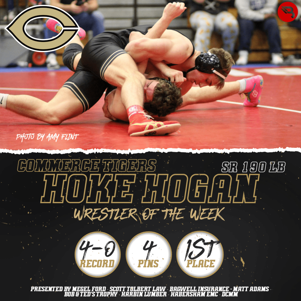 Hoke Hogan not only has an incredible name, but he’s just as awesome on the mat. The senior, wrestling at 190 LB, went 4-0 with 4 pins to become the heavyweight Champion at the Panther Invitational for Commerce last week. This is Hogan’s first POW award.