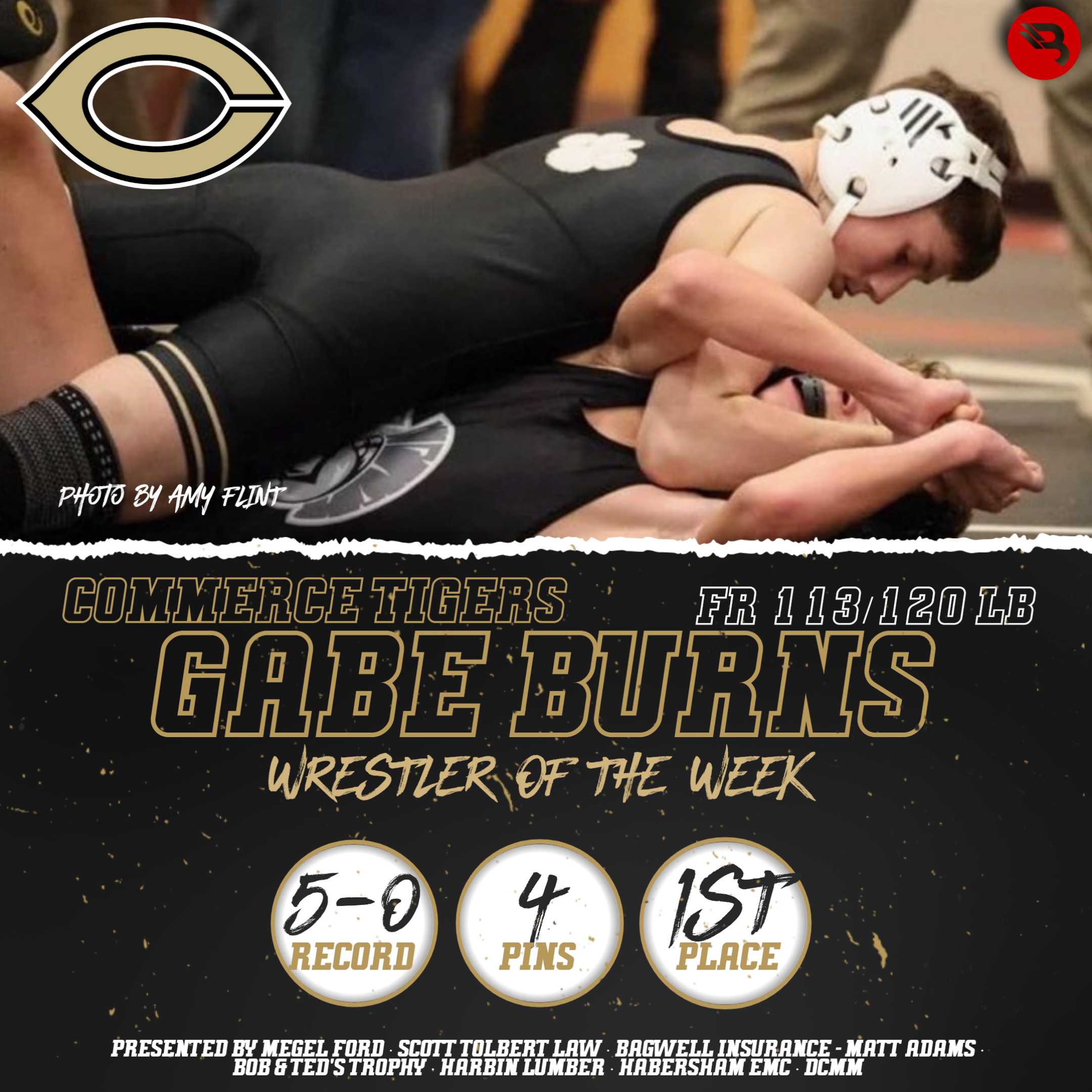 Freshman Gabe Burns went 5-0 last week for the Commerce Tigers, racking up 4 pins and a 1st-place finish. The 113/120 lber takes his first Wrestler of the Week award.