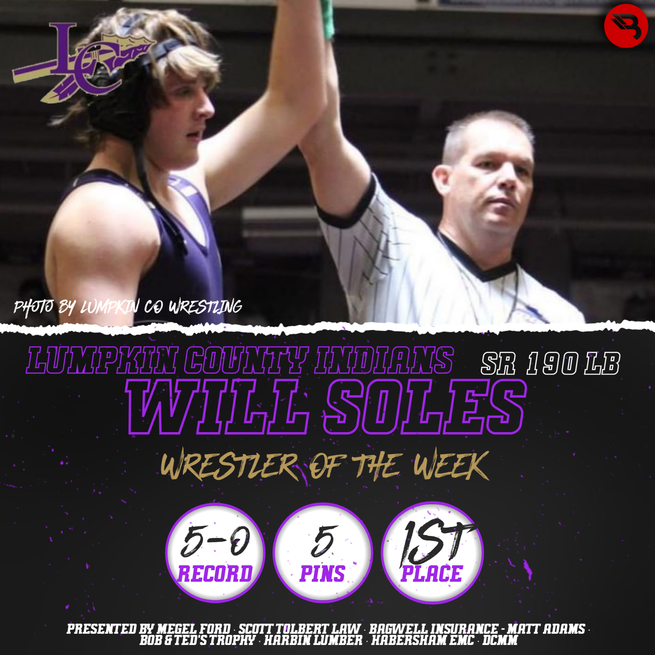 Will Soles went a perfect 5-0 with 5 pins last week for Lumpkin, finishing 1st place in the 190 lb bracket as the Knightmare Before Christmas Champion. This is the senior’s first POW award.