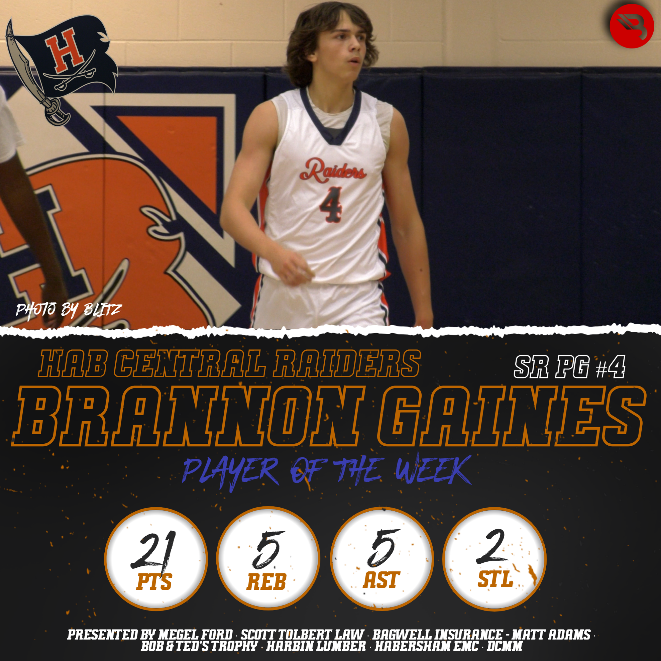 One of the top point guards in the area, Brannon Gaines takes his first well-earned POW award. The senior had 21 points with 5 assists, 5 rebounds, and 2 steals last week for the Raiders in their lone game.