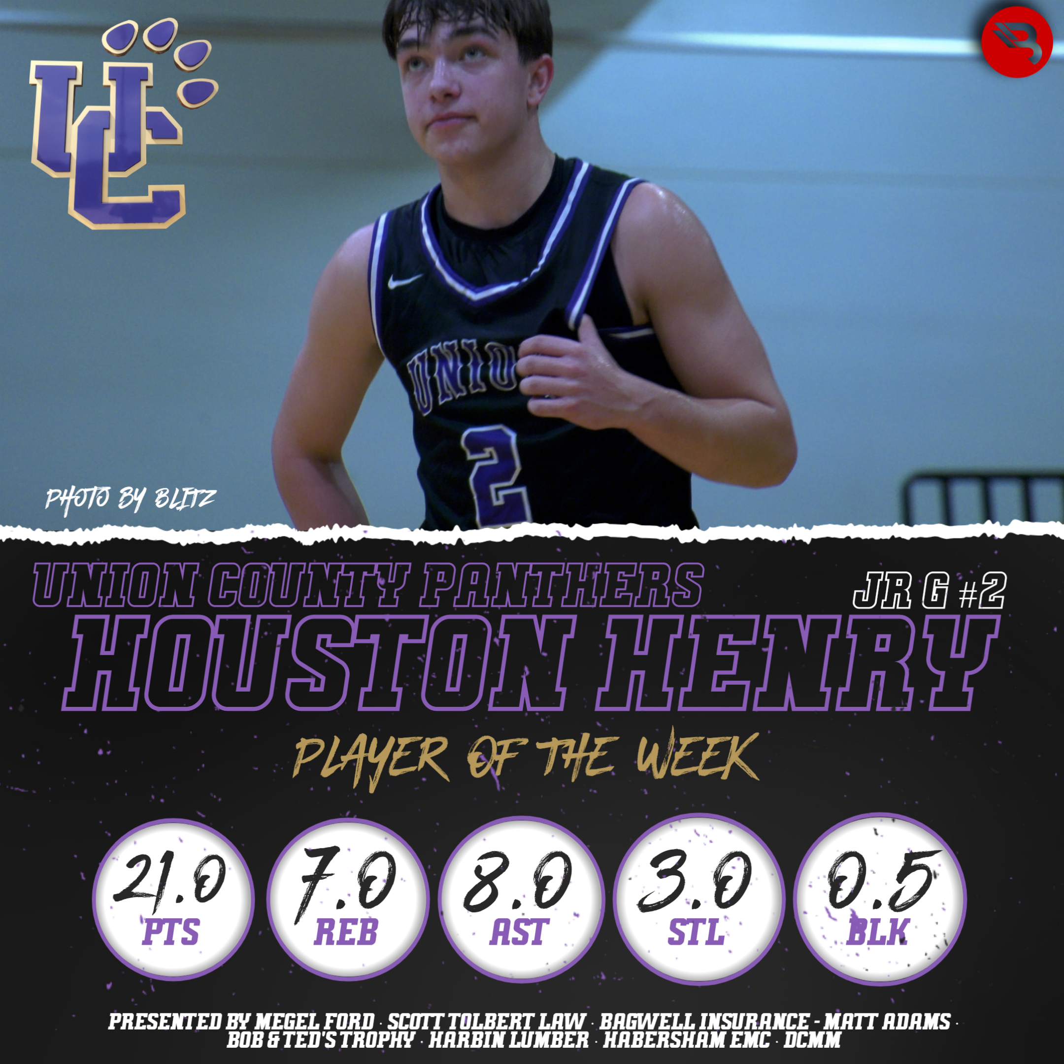 Video game numbers. That’s what Houston Henry put up last week for #5-ranked Union County. The Panthers’ junior guard averaged 21 points, 7 rebounds, 8 assists, 3 steals, and 0.5 blocks, earning his second POW award this season and fourth of his career.