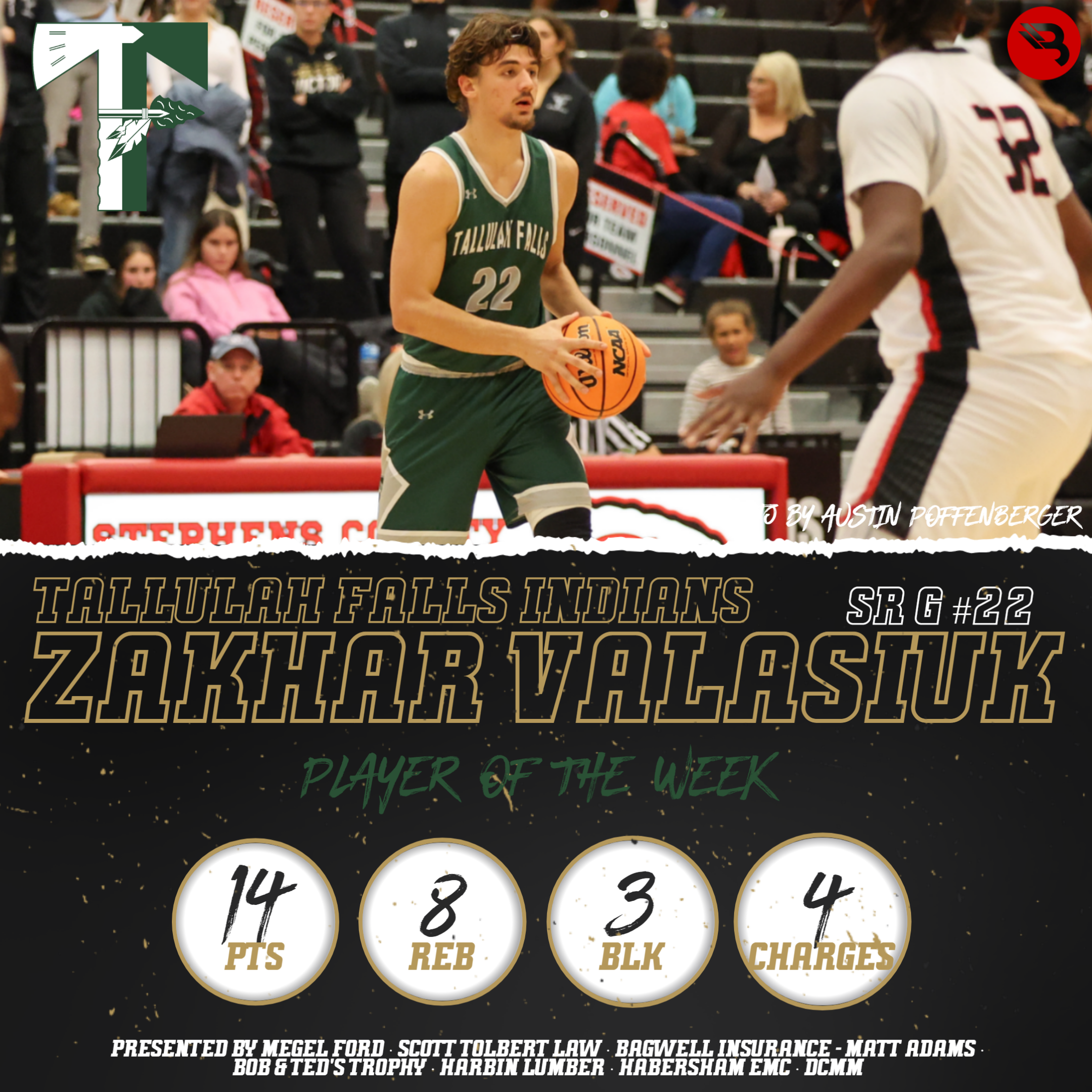 Zakhar Valasiuk had a career night in Tallulah Falls’ lone game last week. The senior guard went for 14 points and 8 rebounds, and added 3 blocks and a school record 4 charges taken. This is his first POW award.