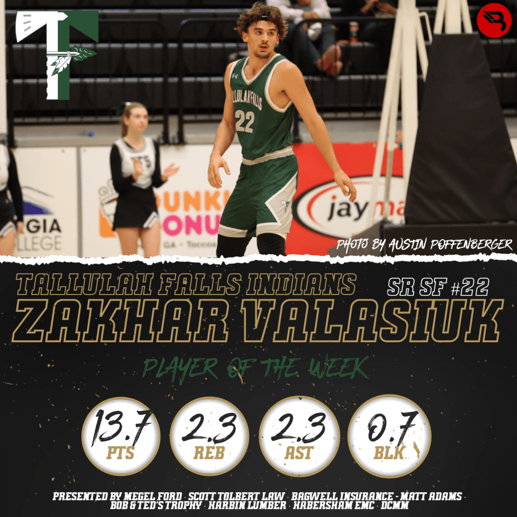 For a second time in 3 weeks, senior guard Zakhar Valasiuk for Tallulah Falls takes POW honors. He averaged 13.7 points, 2.3 rebounds, 2.3 assists, 0.7 blocks, and 0.7 steals per game last week in 3 contests.