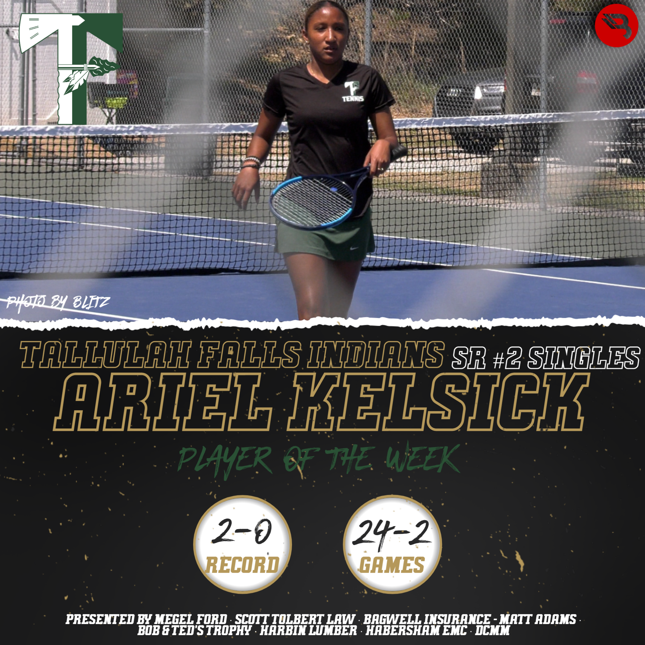 The BLITZ Girls Tennis Players of the Week are Ariel Kelsick (Tallulah Falls) and Maddie McGee (Stephens County). Kelsick won the Fan Vote with 10,607 of the 23,537 total votes. McGee was the BLITZ Pick.