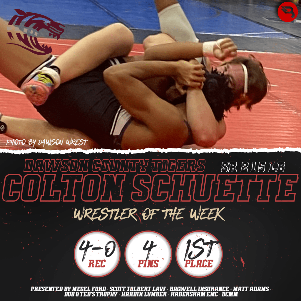 The BLITZ Wrestlers of the Week are Nathan Nielsen (Lumpkin County) and Colton Schuette (Dawson County). Nielsen won the Fan Vote with 3,386 of the 4,882 total votes. Schuette was the BLITZ Pick.