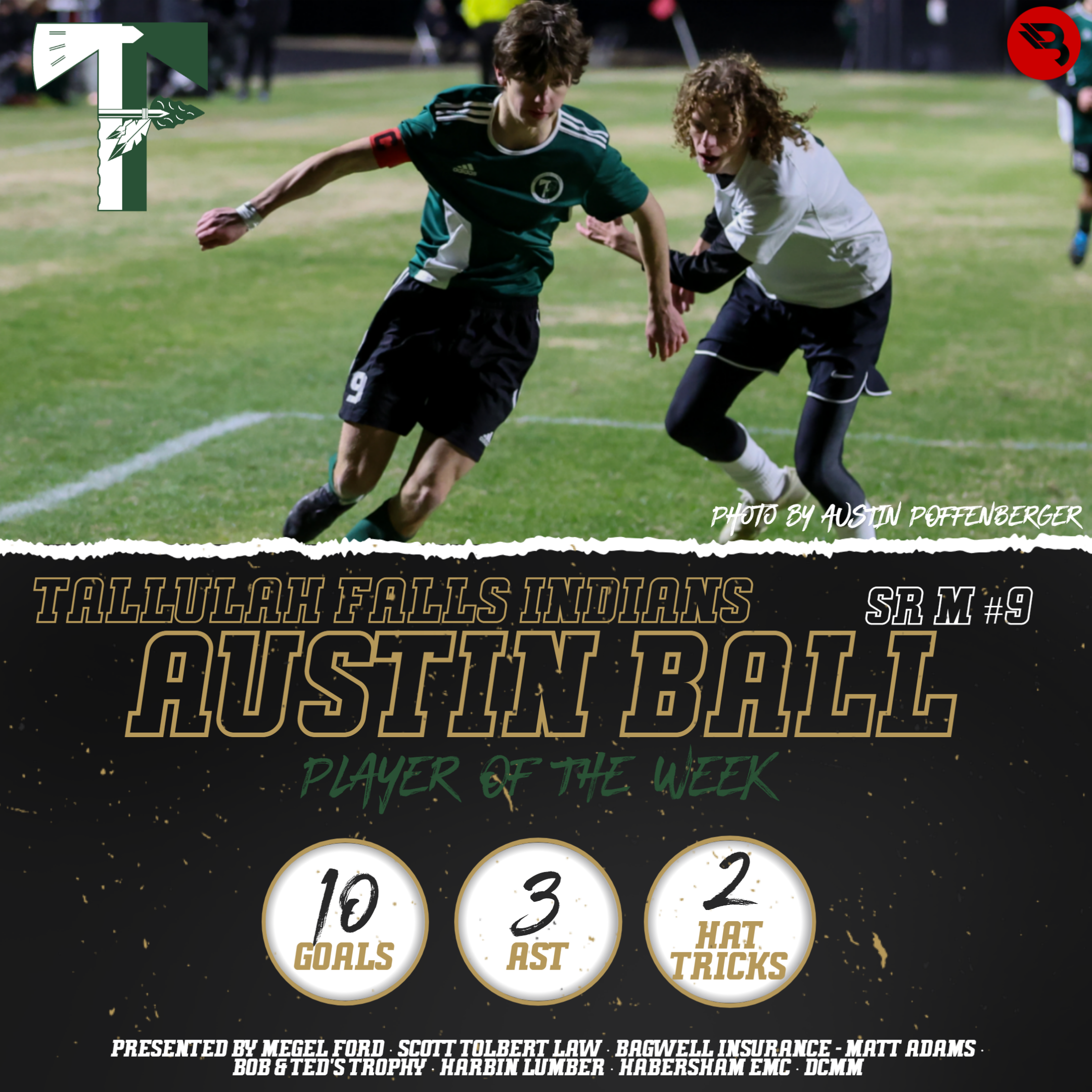 Austin Ball just 2 games in has 10 goals. Let that sink it. He tied the Tallulah Falls school record (which he shared) with 5 goals in a match. Twice this season already. He also found time to notch 3 assists. Ball is the single-season and all-time leader in goals and assists for the Indians, and is on track to shatter his previous goals record. This is his fourth career POW award.