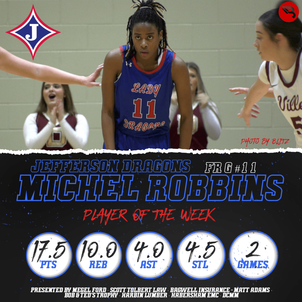Michel Robbins has had a remarkable freshman season. The guard averaged 17.5 points, 10.0 rebounds, 4.0 assists, and 4.5 steals in her first-ever region tournament, guiding Jefferson to a second straight title. This is her second POW award.