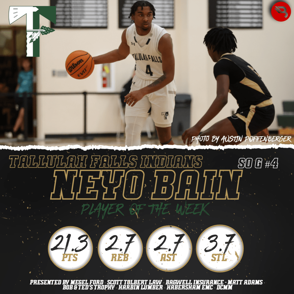 Sophomore sensation Neyo Bain had a fantastic first region tournament. The guard averaged 21.3 points, 3.7 steals, 2.7 rebounds, and 2.7 assists for Tallulah Falls. He had a 30-point outing against Athens Christian in the semfinal round. This is his third POW award.