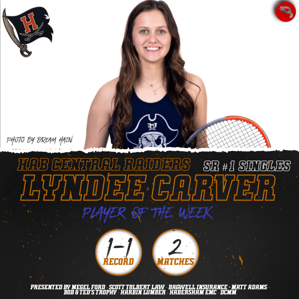 Lyndee Carver went 1-1 for the Habersham Lady Raiders last week in her 2 matches, earning her POW honors. The senior #1 singles player has 3 career POW awards.